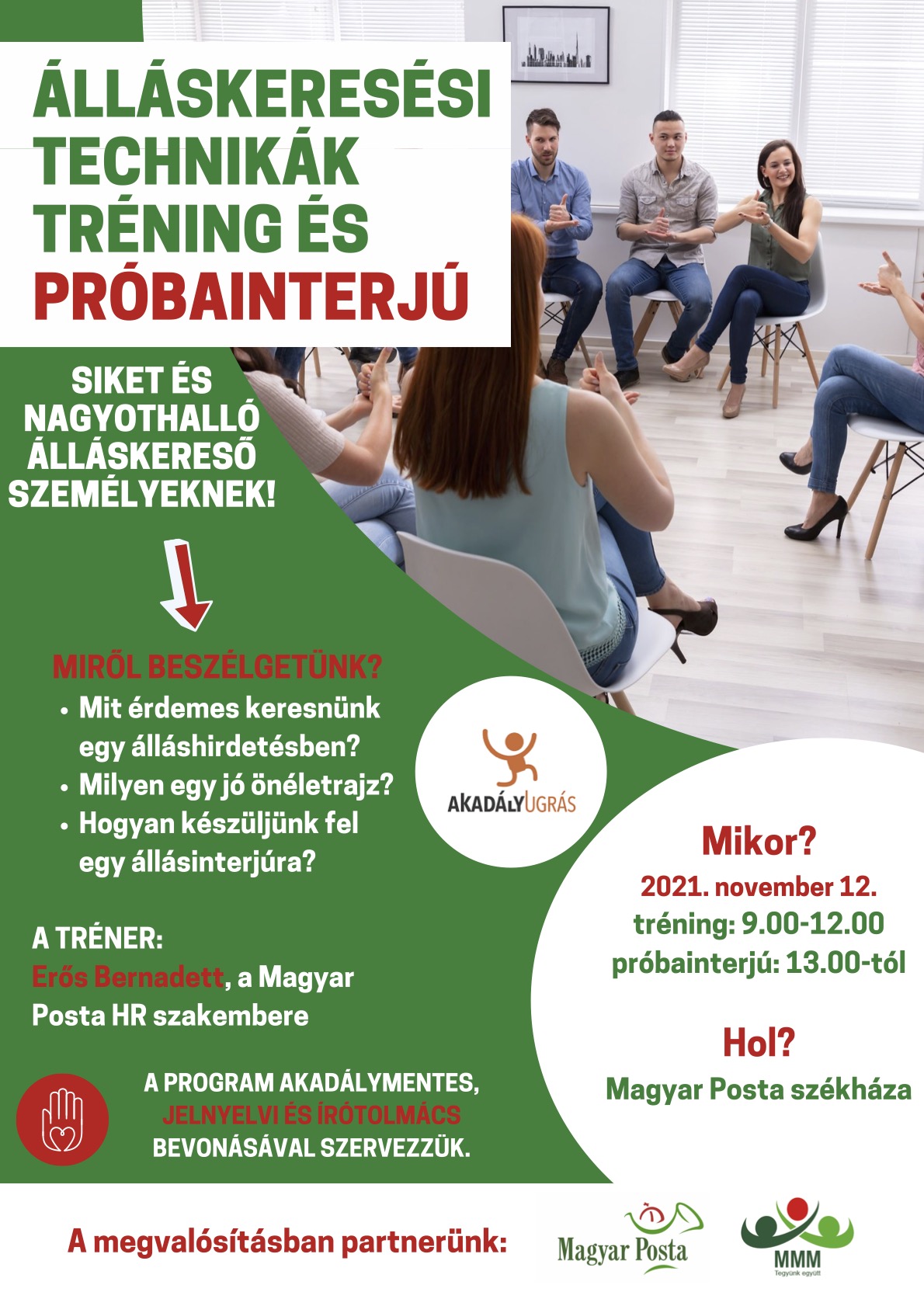 A Magyar Posta és a Siketek és Nagyothallók Országos Szövetsége együttműködésben álláskeresési technikák tréninget és próbainterjúkat szervez 2021. november 12-én. A programra várjuk szeretettel azokat a siket és nagyothalló személyeket, akik jelenleg álláskeresők vagy munkahelyet szeretnének váltani és úgy érzik jól jönne egy kis támogatás, tudásbővítés, gyakorlás.