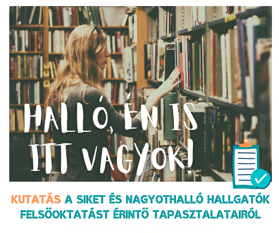 Kérlek, hogy válaszaiddal járulj hozzá a kutatás eredményes megvalósulásához, szánj kb. 25-30 percet a kérdőív kitöltésére. A kérdőív kitöltésével kapcsolatban egyaránt várjuk a nappali és a levelező tagozaton tanulmányaikat végző siket és nagyothalló hallgatók válaszait, bármely korosztályból.