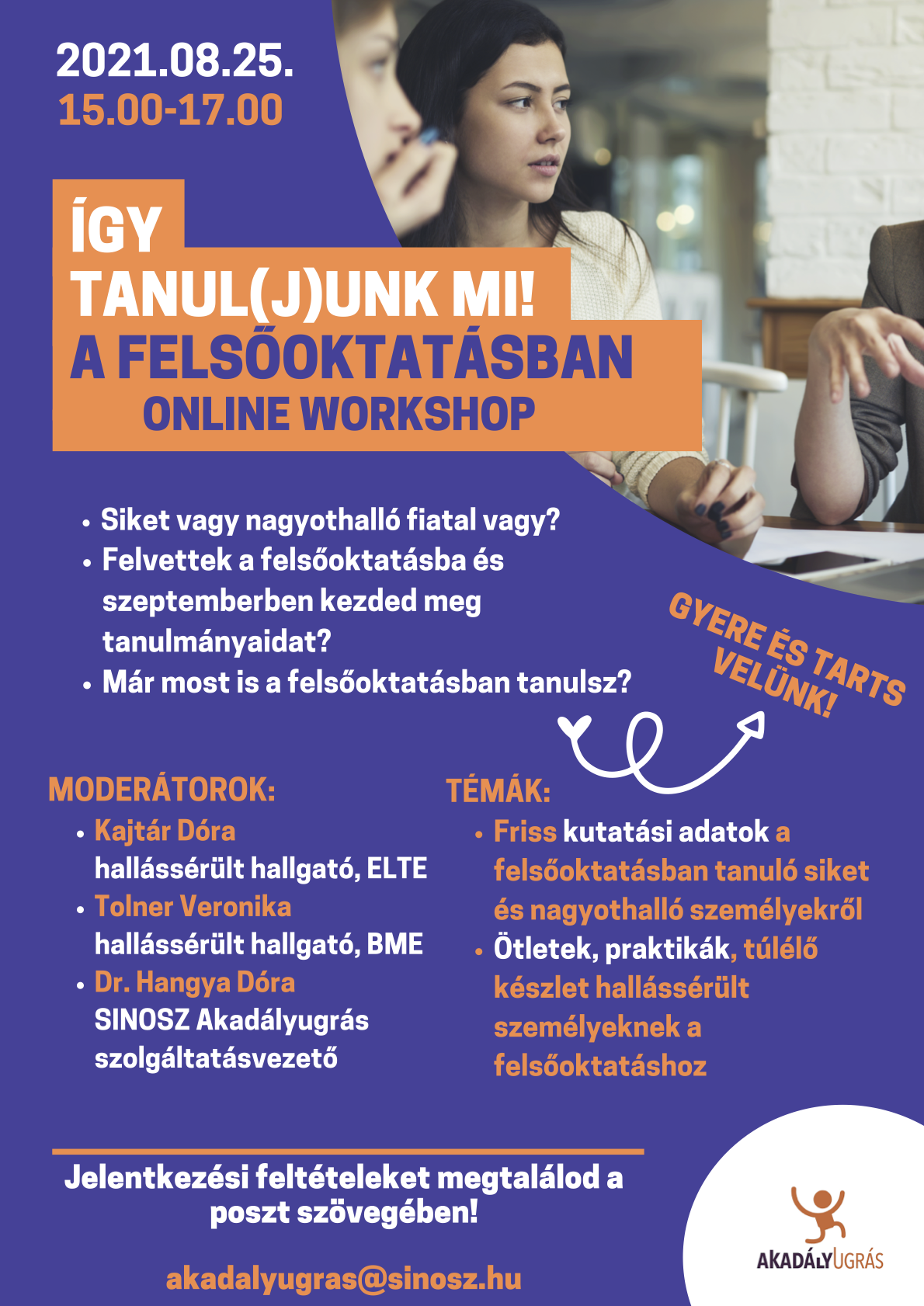 Ezen kutatás eredményeit ismerhetik meg az érdeklődők a workshopon, illetve tapasztalatcserére, közös gondolkodásra is lehetőség nyílik az online rendezvényen. A beszélgetést két hallássérült hallgató, Kajtár Dóra (ELTE) és Tolner Veronika (BME) valamint Dr. Hangya Dóra a SINOSZ Akadályugrás szolgáltatásvezetője moderálja.