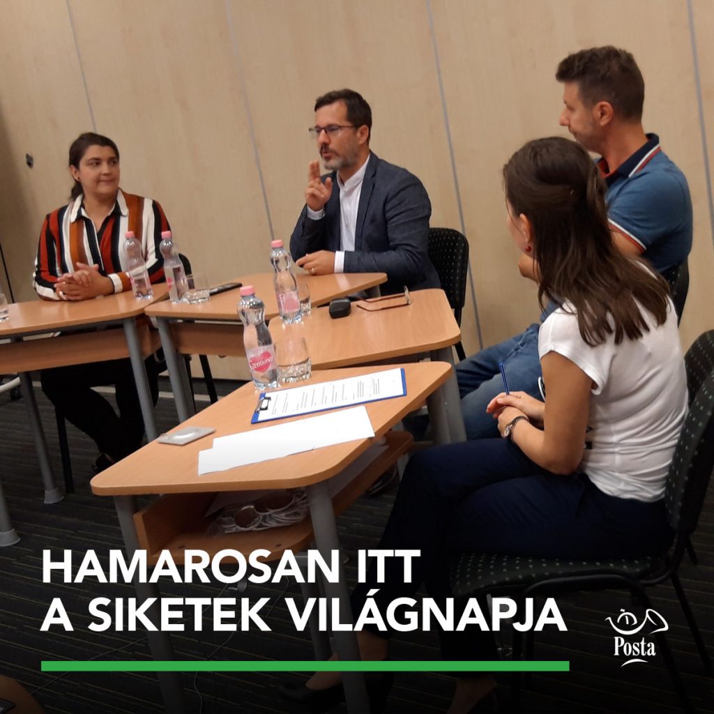 A Magyar Posta és a sinosz.hu Siketek és Nagyothallók Országos Szövetsége közös programmal készült a siketek világnapja alkalmából, szeptember 17-én. A kerekasztal-beszélgetésen 3 siket személy vett részt a SINOSZ képviseletében. Az eseményen szó volt a siket közösséget érintő mindennapi kihívásokról, lehetőségekről és az inklúzió fontosságáról. A kerekasztalt követően az általunk megvalósított jelnyelvi mini tréningen postai kifejezéseket tanult meg jelelni a vállalat több mint 40 munkatársa és postai szituációban ki is próbálhatták azokat.